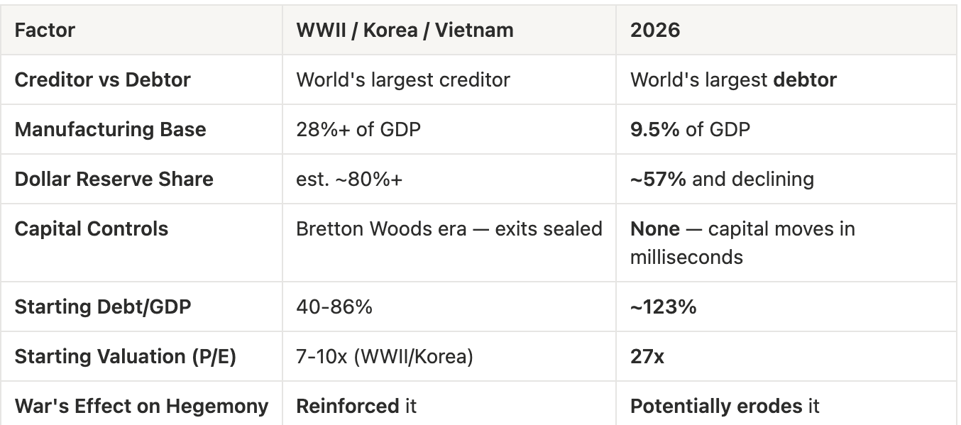 Debt/GDP at ~123% — already exceeding the WWII peak. No Marshall Plan on the other side. No Bretton Woods II. Unlike 1945, the US won’t emerge as the sole industrial power — China’s manufacturing base is intact, and the war’s destruction is in a region that won’t need American-led reconstruction.
