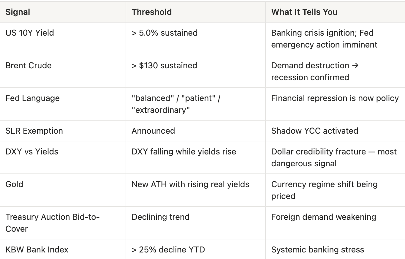 The critical signal: watch the DXY against yields. Rising yields should strengthen the dollar. If yields rise and the dollar falls — that’s the market pricing a credibility fracture. That’s when the 1940s playbook breaks.