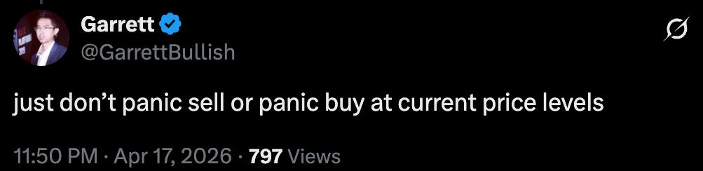 Though strictly speaking, the real “everyone wiped out” day was the April 8 ceasefire. WTI –15% on the day (per Bloomberg, the largest single-day drop in nearly six years), Brent –16%. That session cleaned out the speculative WTI longs that had been chasing the rally for weeks. April 17 took out the next batch: the WTI longs who, after April 8, had bought the dip and bet “this time it’s really over.”