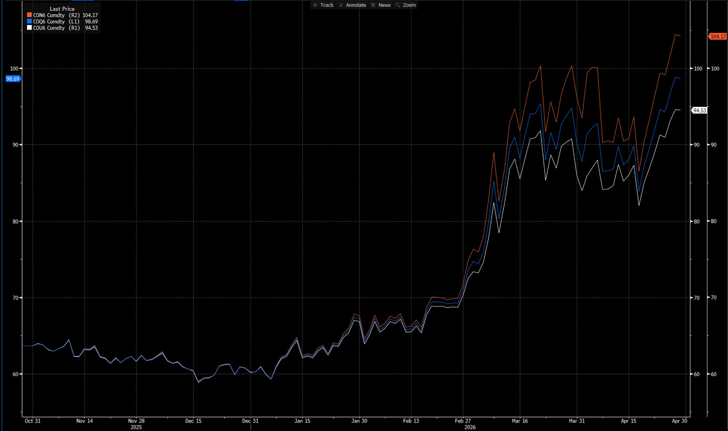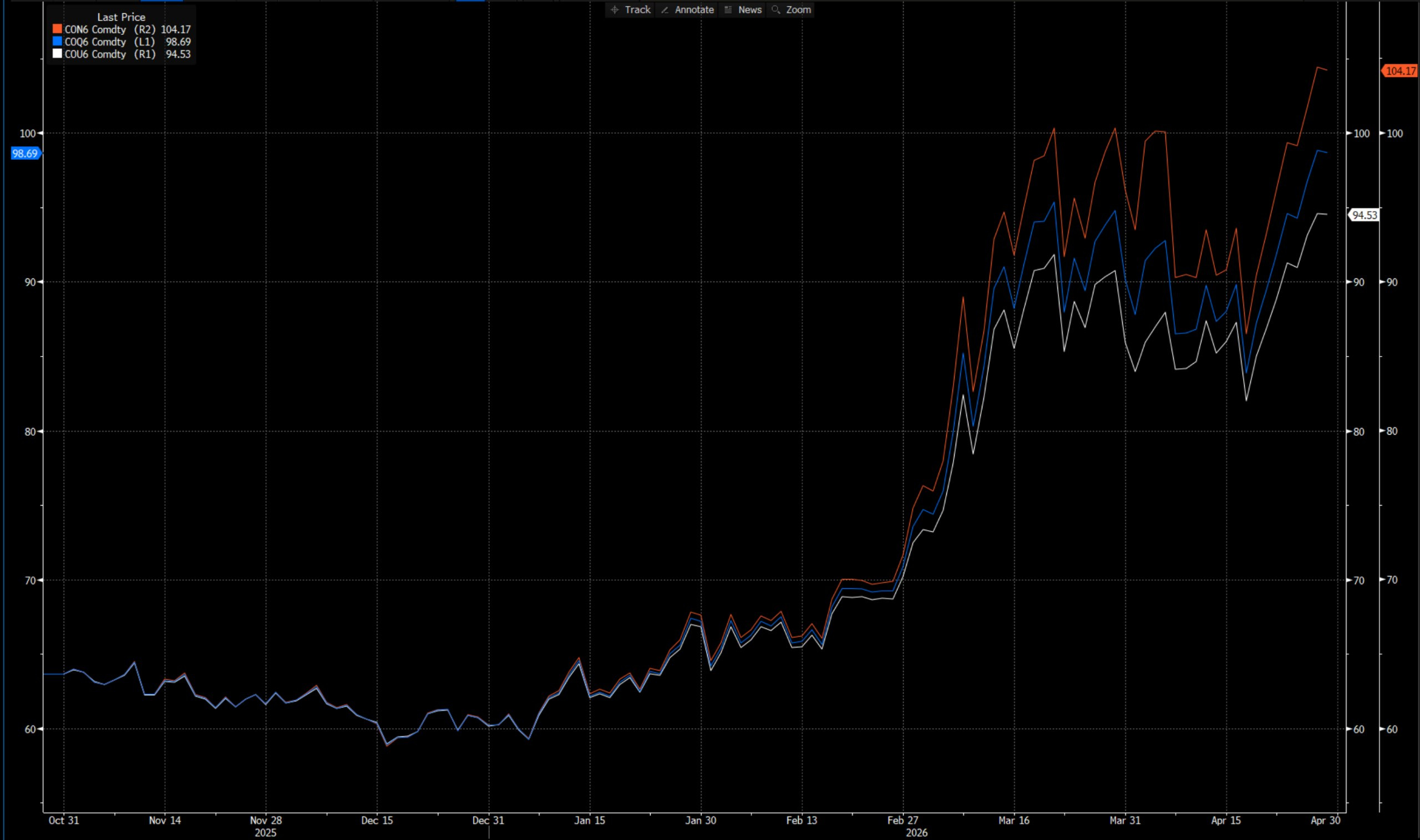 At the far right, even the September contract is making new highs. The back end is catching up to the front. Five months from spot is no longer being treated as “post-war normal.” The market is pricing the war into Q3.