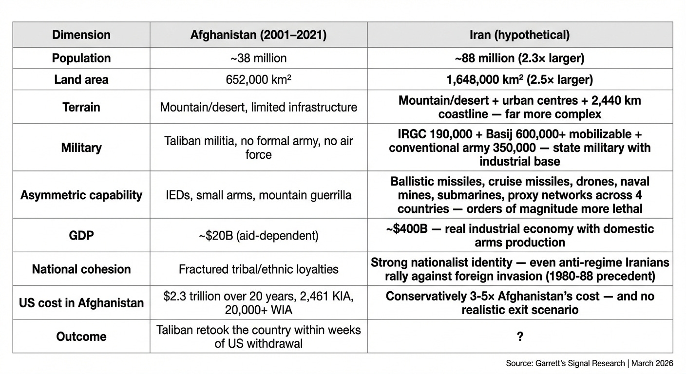 But committing ground forces to Iran would mean entering a theatre that makes Afghanistan look manageable. Consider the comparison: