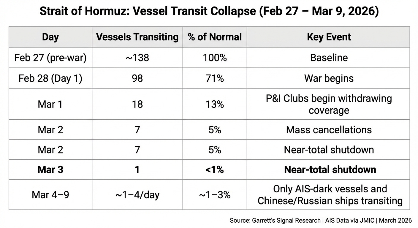 The Strait of Hormuz remains functionally closed: only 9 commercial vessels have transited since March 3.