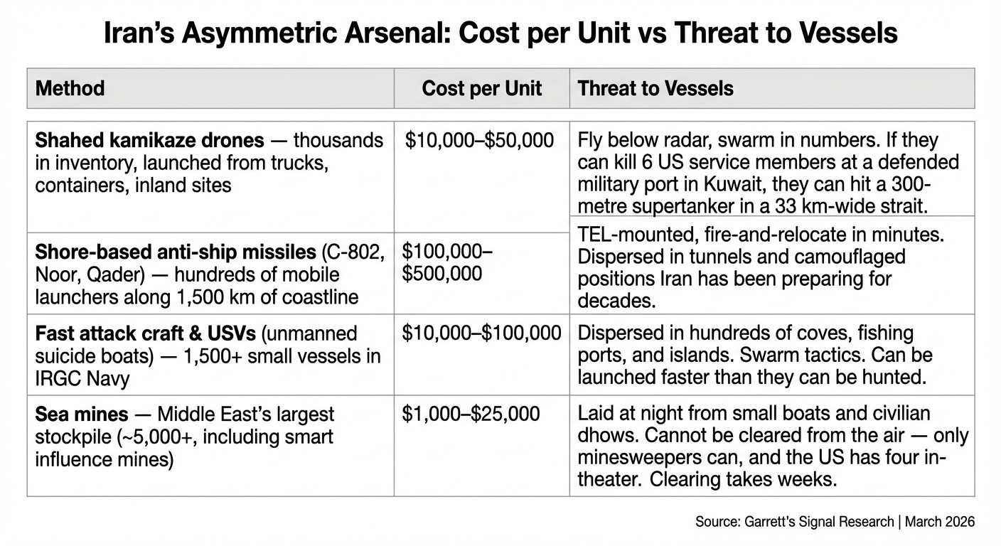 1. Hormuz is the real battlefield — and it has no military solution. The strait is closed not by a physical blockade but by the lethal interaction of Iran’s cheap, dispersed asymmetric arsenal and the global marine insurance system’s rational withdrawal. Air strikes have destroyed Iran’s conventional navy, but the IRGC can threaten any vessel with drones, mines, missiles, and fast boats at a fraction of the cost of interception. Every escalation reinforces the actuarial risk that keeps P&I Clubs out, ports closed, and crews grounded. More bombing equals longer closure.