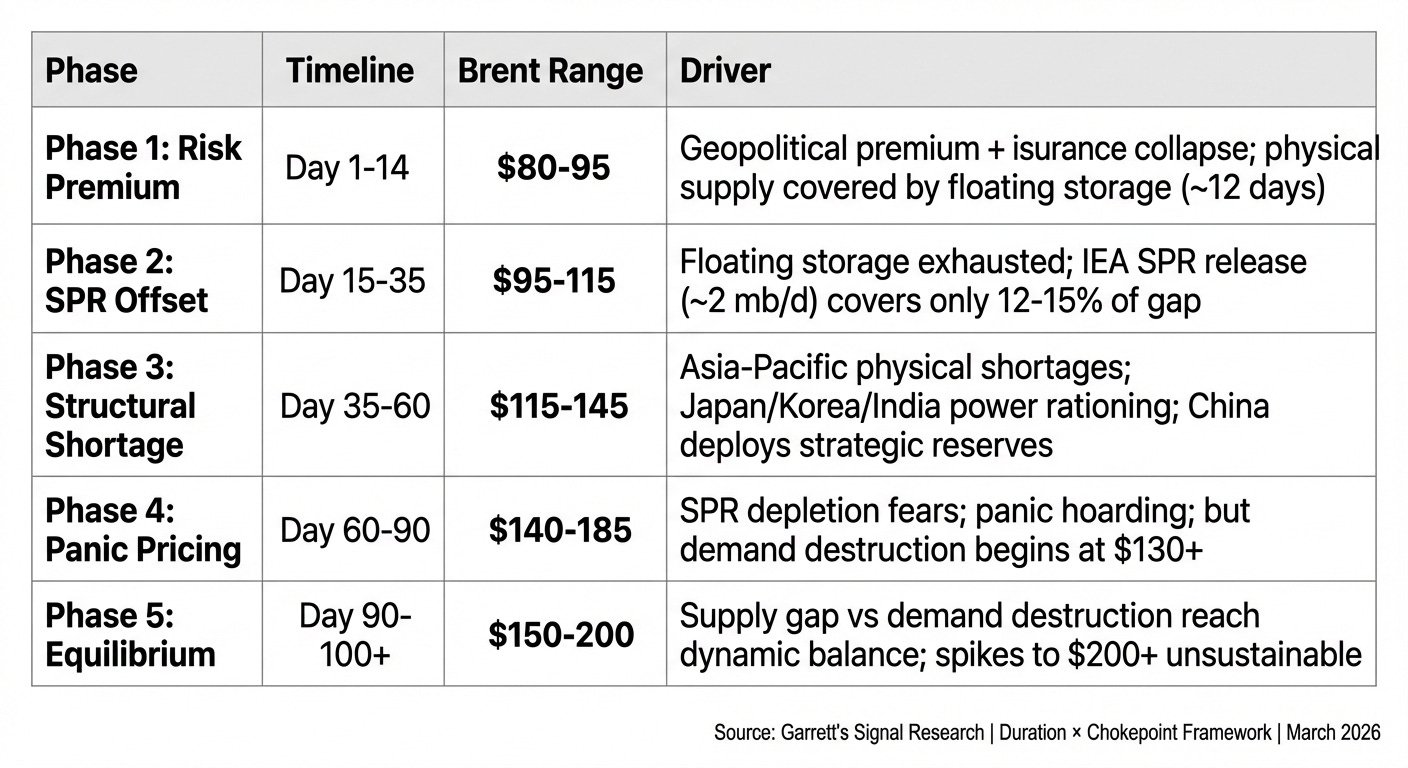 Gross gap vs. net effective shortage. The 14–16 mb/d figure is the gross disruption — total Hormuz flow minus pipeline bypass capacity. The net effective shortage will be smaller, because high prices trigger demand destruction (estimated short-run elasticity: ~0.03–0.05), fuel switching, rationing, and drawdowns from non-Hormuz sources. At $120+ Brent, demand destruction of 1–2 mb/d is plausible within 30 days; at $150+, 3–5 mb/d. Combined with SPR releases (~2 mb/d) and limited non-OPEC supply response, the net effective gap at Phase 3 pricing is more likely 6–10 mb/d, still historically unprecedented, but meaningfully smaller than the gross headline figure. We use the gross number to frame the scale of the disruption; the phased pricing model in Section VI incorporates demand-side offsets.