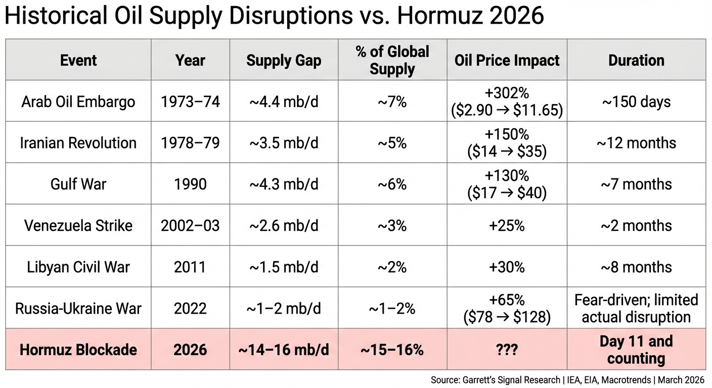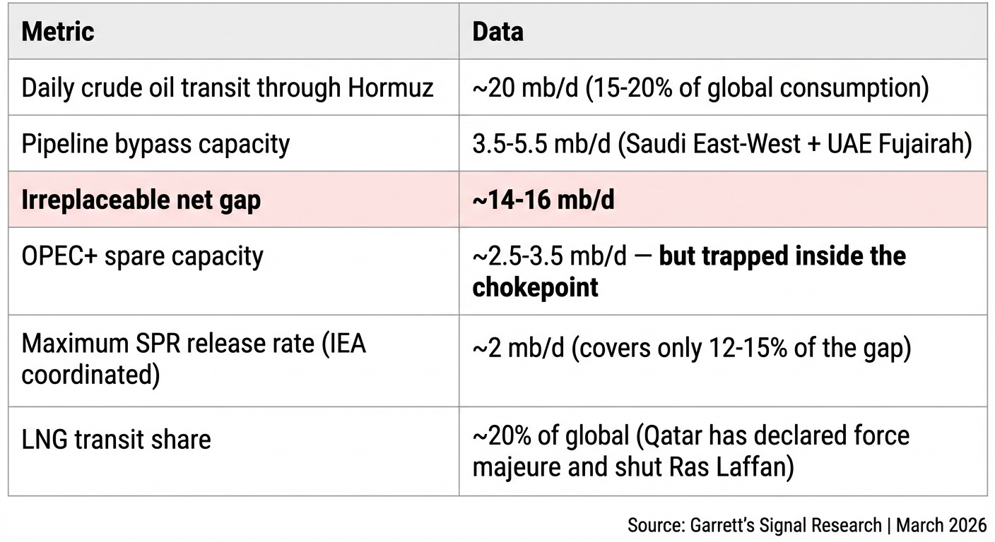 2. Duration — not intensity — is the variable that matters most. At $119.50, Brent has begun to reprice — but only for Phase 1–2 of what could be a multi-month disruption. The potential supply gap (~14–16 mb/d) dwarfs every historical precedent. Pipeline bypasses cover less than a third; SPR releases cover ~12–15% at best; and OPEC+ spare capacity is trapped inside the chokepoint. If Hormuz remains functionally shut beyond Day 35, we enter uncharted territory — Phase 3 structural shortage — where Asia-Pacific physical deficits force rationing and oil moves toward $140+. The repricing has begun; it has not finished.