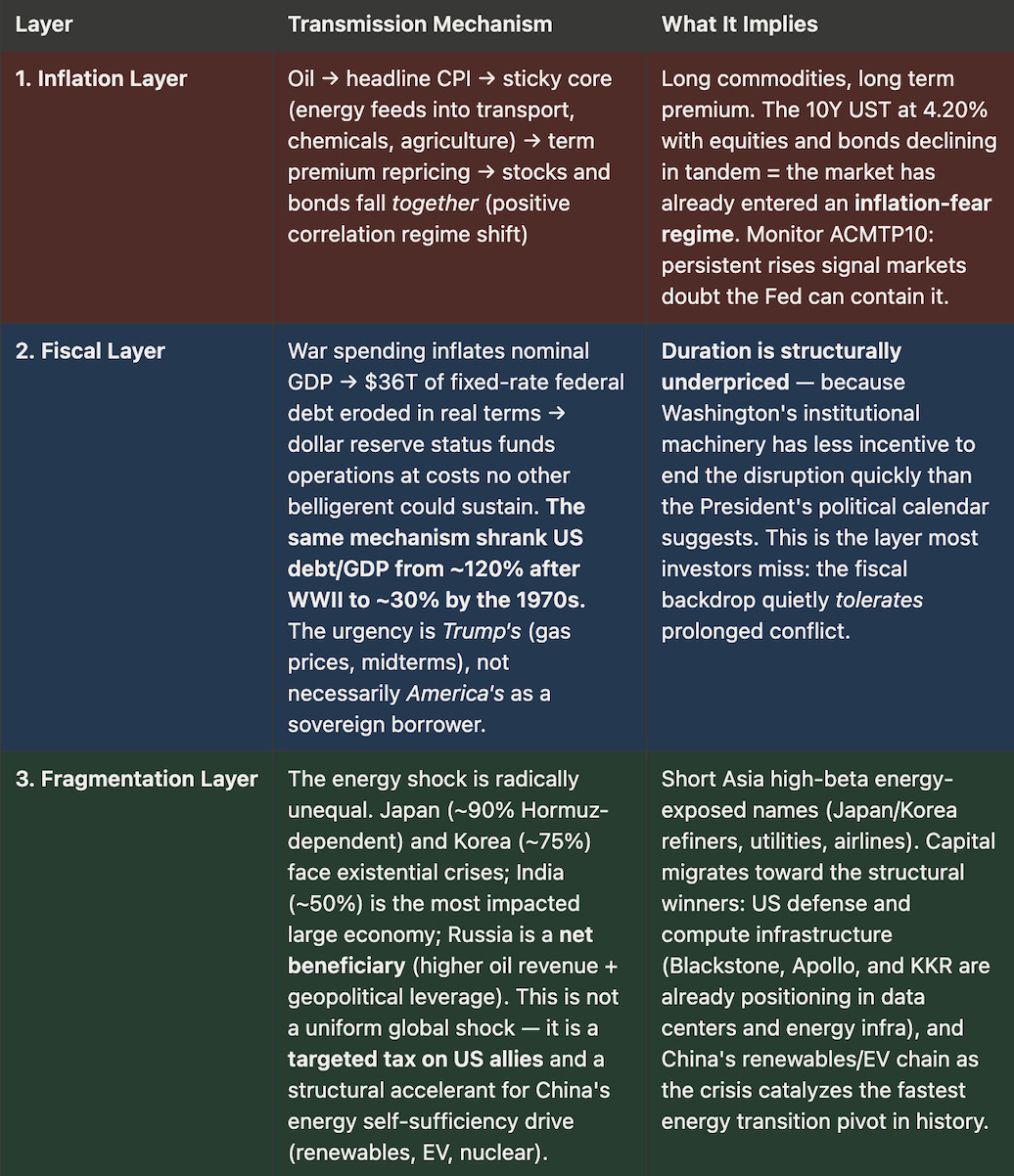 Why the Triple Prism matters: Each layer alone would pressure risk assets. But the three layers are self-reinforcing: the Inflation Layer keeps rates high, the Fiscal Layer removes Washington's incentive to resolve it quickly, and the Fragmentation Layer ensures the pain falls disproportionately on energy-importing allies while creating pockets of structural winners. The result is not just "risk off" — it is a regime change in cross-asset correlation, geographic risk distribution, and the market's willingness to price tail duration. Risk assets stay under pressure until a credible path to Hormuz reopening emerges — and even then, the insurance rebuild alone takes 3–6 weeks.