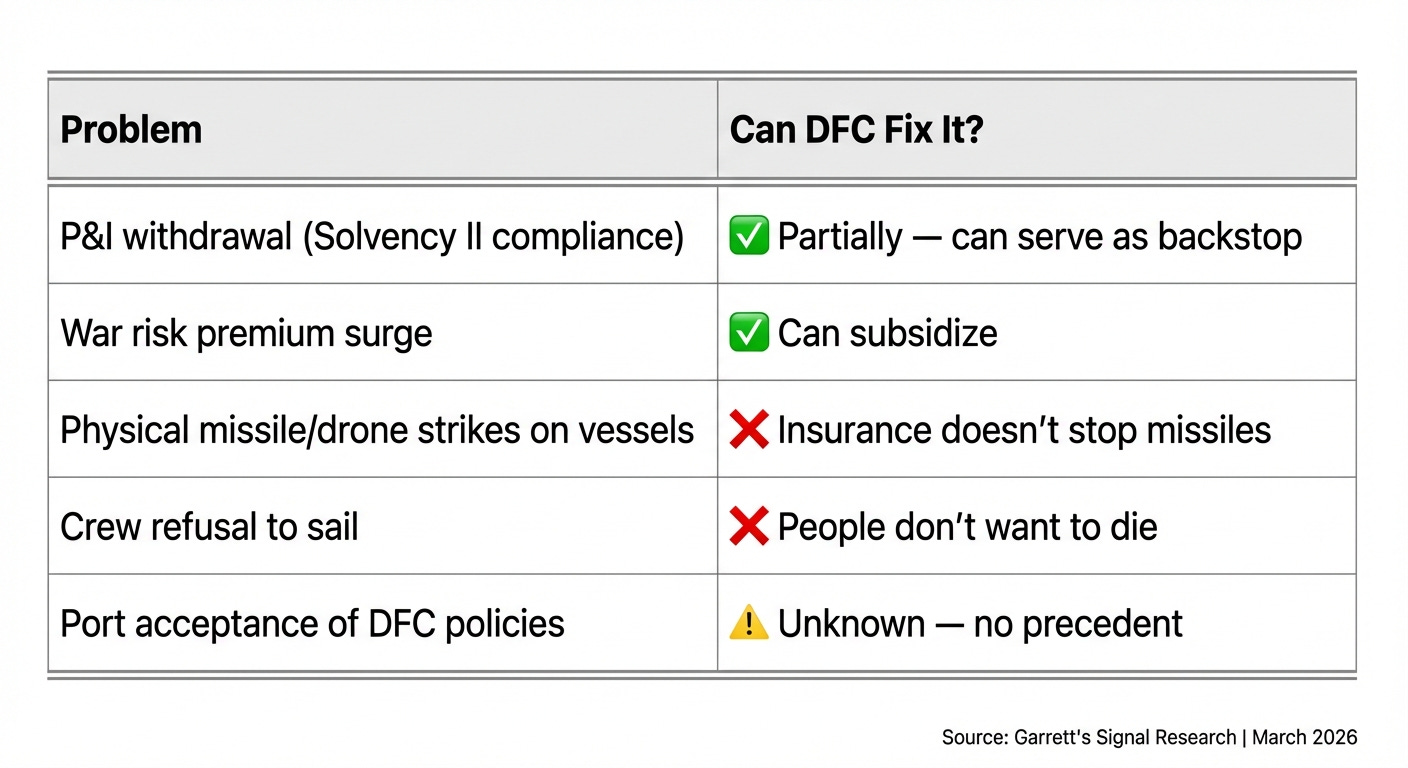 Specific terms still have not been published. Even under the most optimistic assumptions, DFC implementation to first vessel departure requires 1-2 weeks. And one successful Iranian attack on a transiting commercial vessel would instantly destroy all confidence in the "insurance recovery → normalization" thesis.