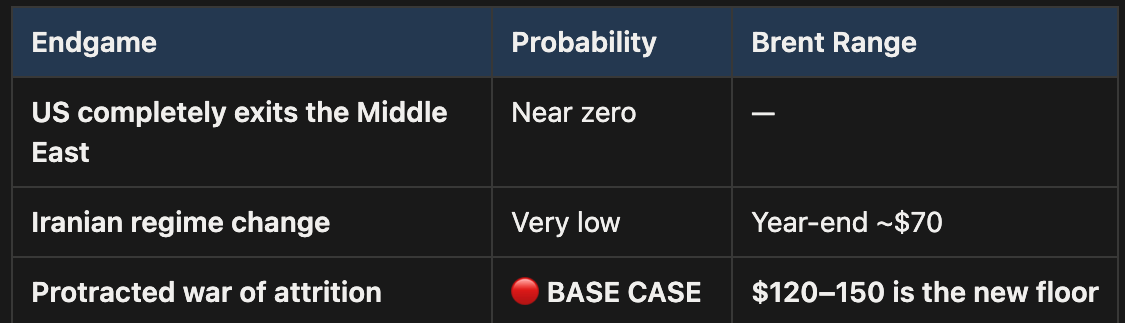 Endgame 3 is the base case, and by a wide margin. A long grind means Hormuz stays disrupted. Oil stays elevated. Structurally, not temporarily. The forward curve is heavily mispricing this.