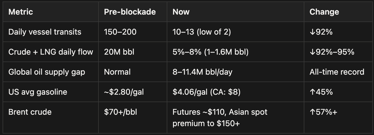 Note: Hormuz normally carries ~20M bbl/day, so the ~18–19M bbl/day lost from Hormuz is larger than the 8–11.4M bbl/day global supply gap. The difference is being partially filled by SPR releases, alternative pipeline routes (Saudi East-West, UAE bypasses), and non-Hormuz producers. That fill is temporary.