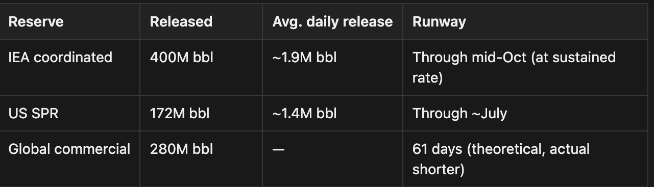 SPR drawdown has a physical ceiling (about 2M bbl/day historically). Actual gap-filling capacity is well below the headline figures.