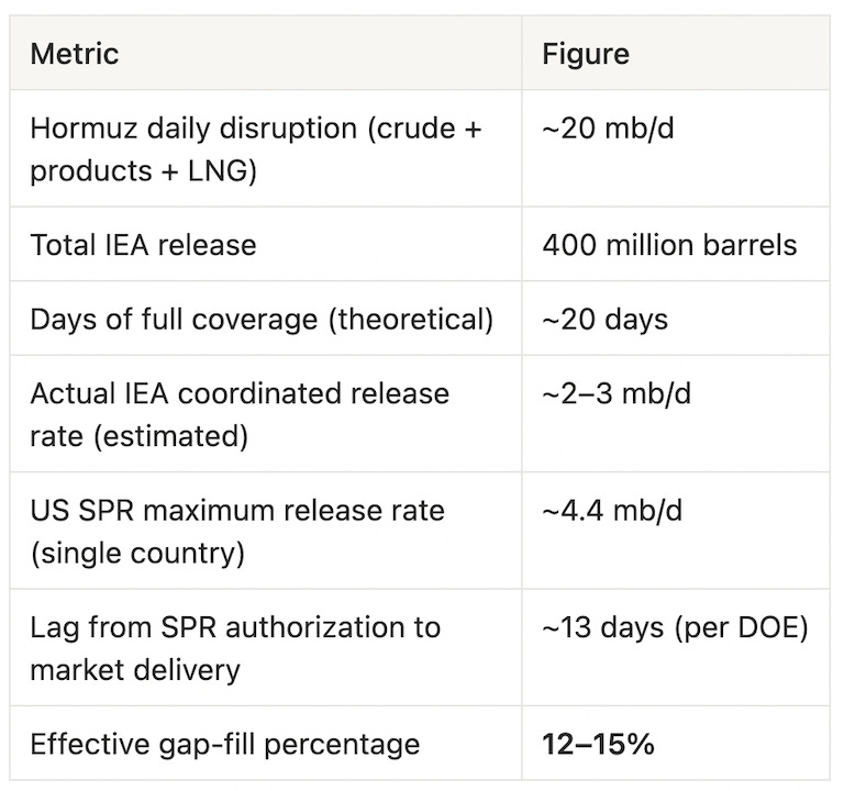 The gap-fill figure is the one that matters. At realistic coordinated release speeds — not the headline barrel number, but the actual daily flow — the IEA’s historic intervention covers somewhere between 12 and 15% of the supply disruption, per Reuters reporting on the release mechanics. It cannot fill the rest. Nothing can except reopening the Strait.