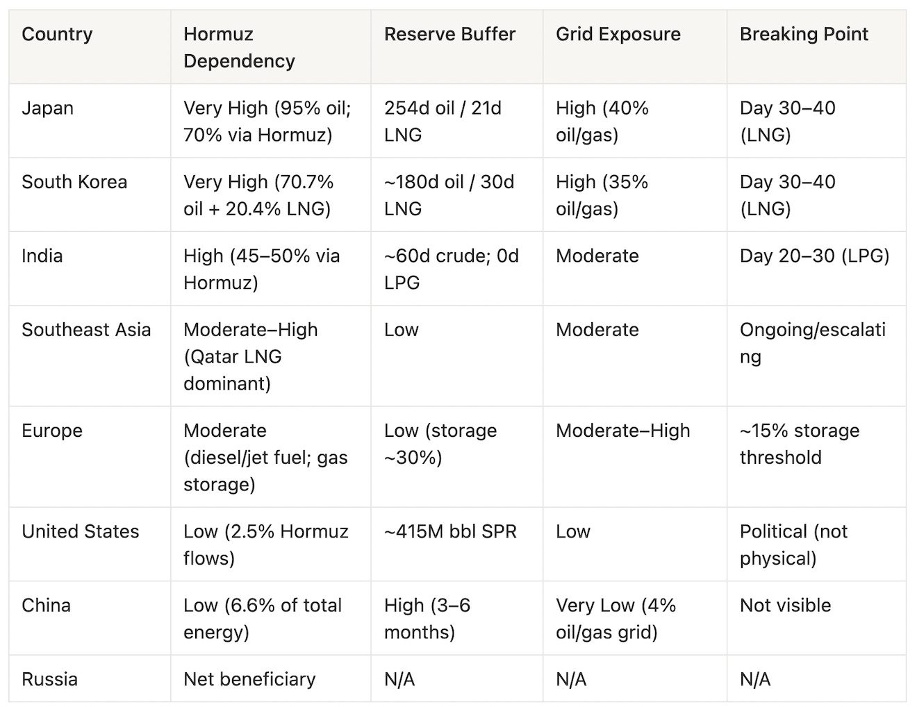 The supply shock is global. The breaking points are not simultaneous. Each country’s clock is ticking at a different speed, shaped by its import dependency, reserve depth, grid composition, and social tolerance for price pain. And as of Day 14, there is a new clock running alongside the others: the US military’s timeline to physically reopen the Strait, estimated at 2 to 4 weeks from now. The question “who breaks first” is now a three-way race between reserve depletion, diplomatic resolution, and military intervention. What follows is a country-by-country vulnerability ranking, from most exposed to least.