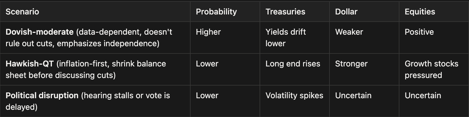 Scenario one is the most likely outcome. The reasoning is simple: the point of a confirmation hearing is to get confirmed, not to pledge allegiance. Nearly every nominee in history has played it vague. Warsh has already pivoted toward moderation in his written testimony.