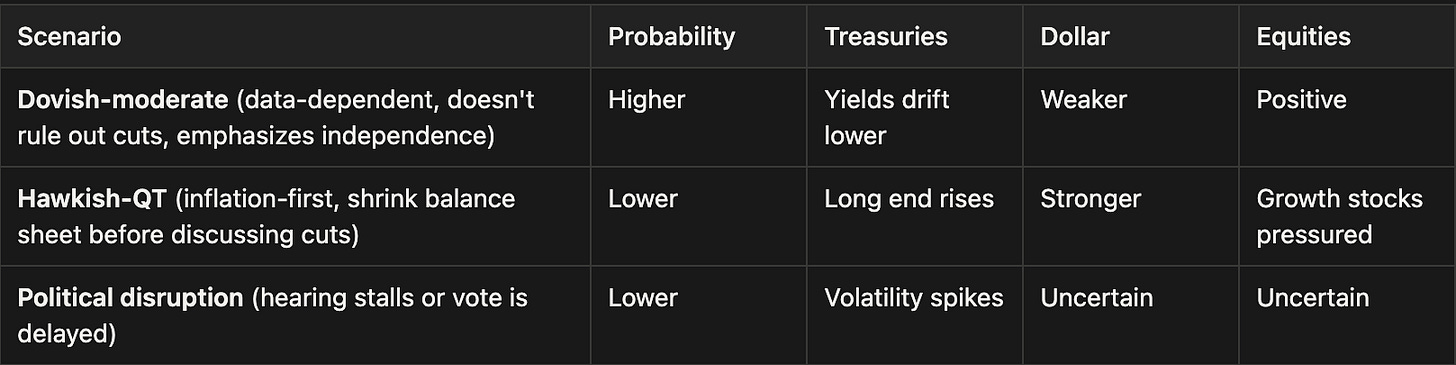 Republican Senator Tillis holds the key to the confirmation timeline. If he softens his stance before or during the hearing, Warsh’s confirmation becomes high-probability. If he holds firm, we could see a Chair vacancy after Powell’s May 15 expiration.